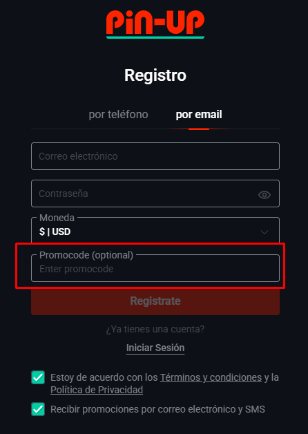 Tu código promocional solo se activará luego de que crees una cuenta y completes el registro. Este proceso no es complicado y te tomará apenas un par de minutos, solo tendrás que ingresar al sitio oficial de Pin-Up, pulsar en “Registrarse” y elegir alguna de las siguientes opciones: